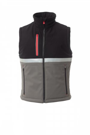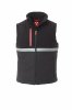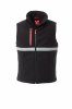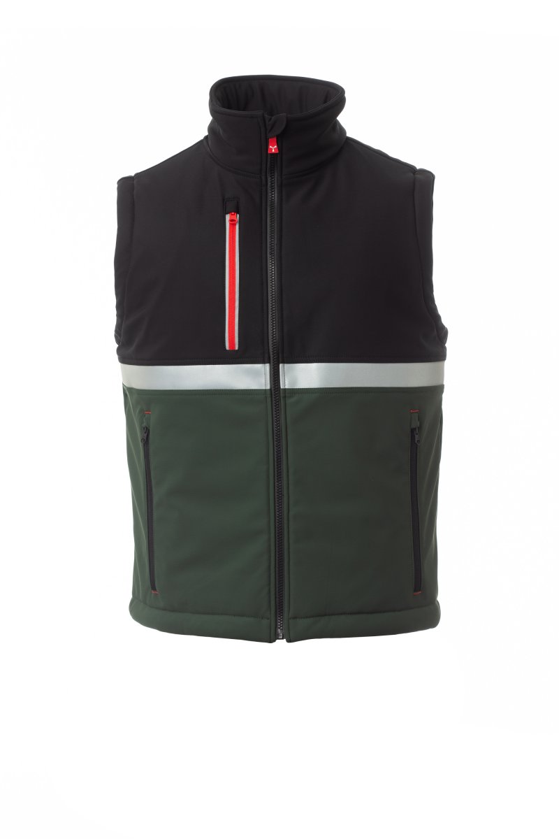 WP 8 000 mm H₂O, WVT 5 000 g/m² 24 h. Miesten 3-kerroksinen softshell-liivi, jossa lämmin toppaus (160 g/m²), kauluksessa lämpimät fleecekappaleet. Sulkimena SBS-vetoketju, jossa on puolilukittuva metallinen liukukappale ja mukautettu vedin. Jälkiheijastava raita rintaosassa. Kaksi vetoketjullista sivutaskua ja vetoketjullinen rintatasku, jossa jälkiheijastava yksityiskohta. Selässä on huomiovärinen kuvio ja oma jälkiheijastava logo. Suljetaan vetoketjulla. Kaksi sisätaskua: yksi vetoketjullinen muotoiltu rintatasku oikealla ja yksi tarranauhalla suljettava tabletille vasemmalla. Säädettävä helma mukautettavilla nyörilukoilla.