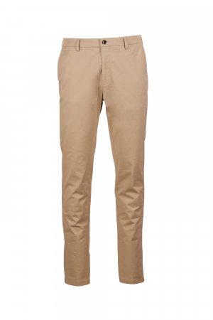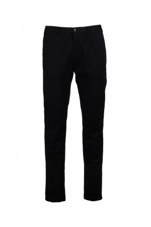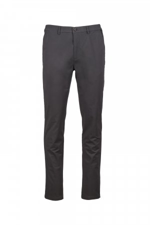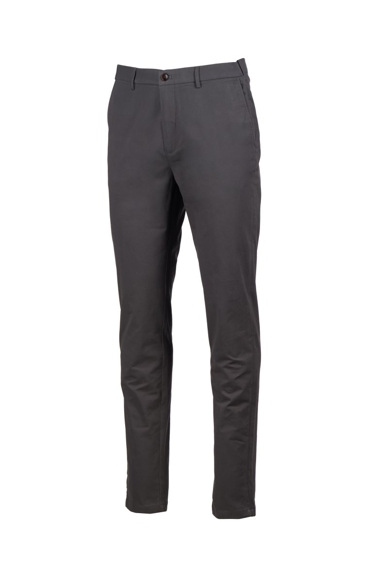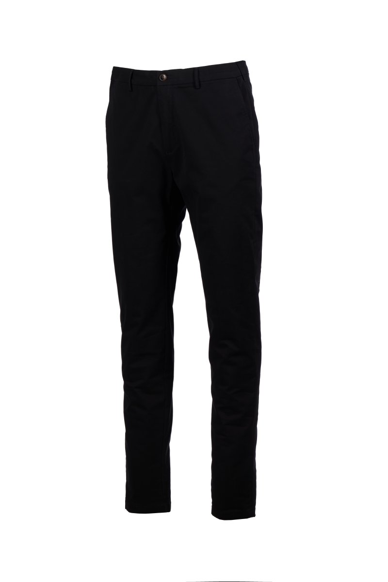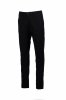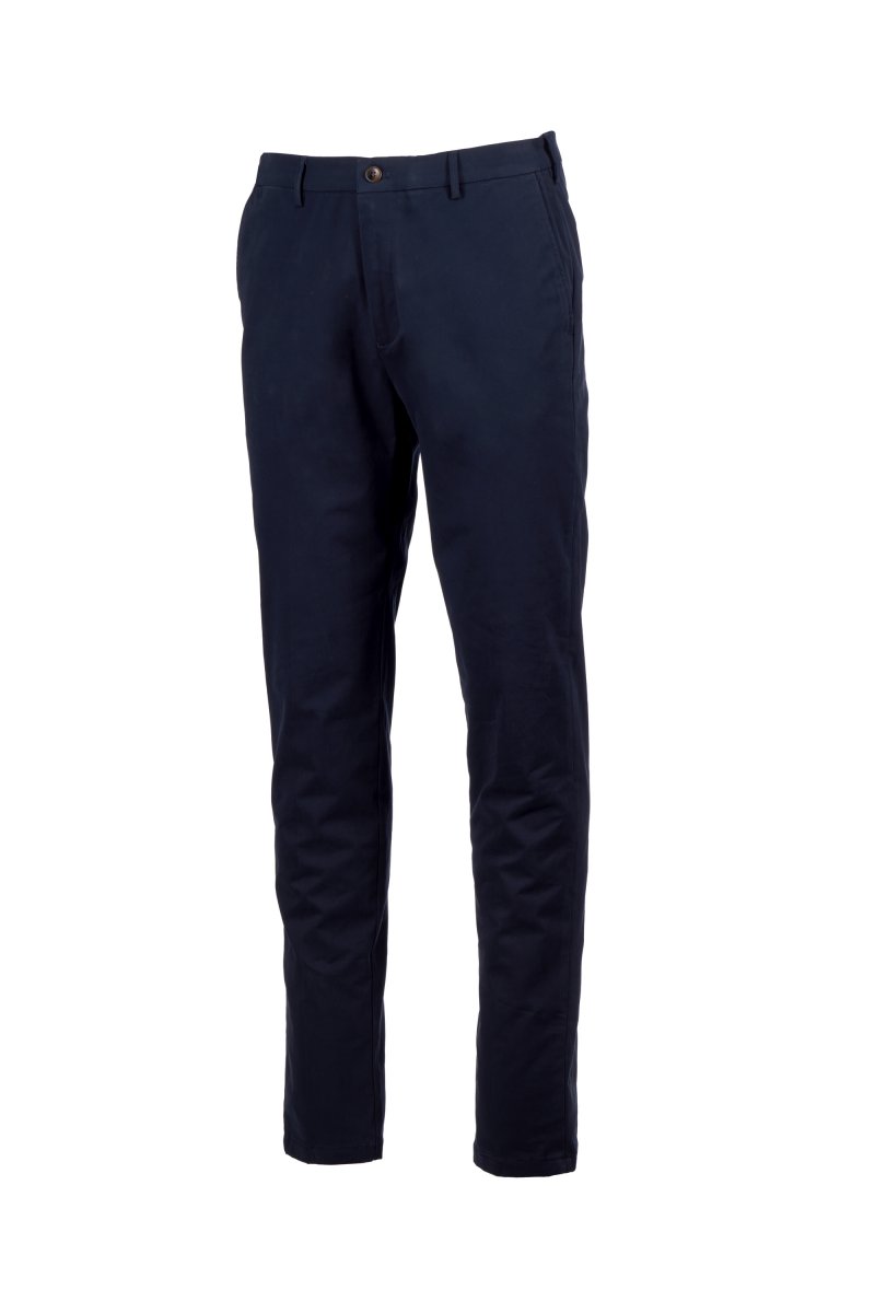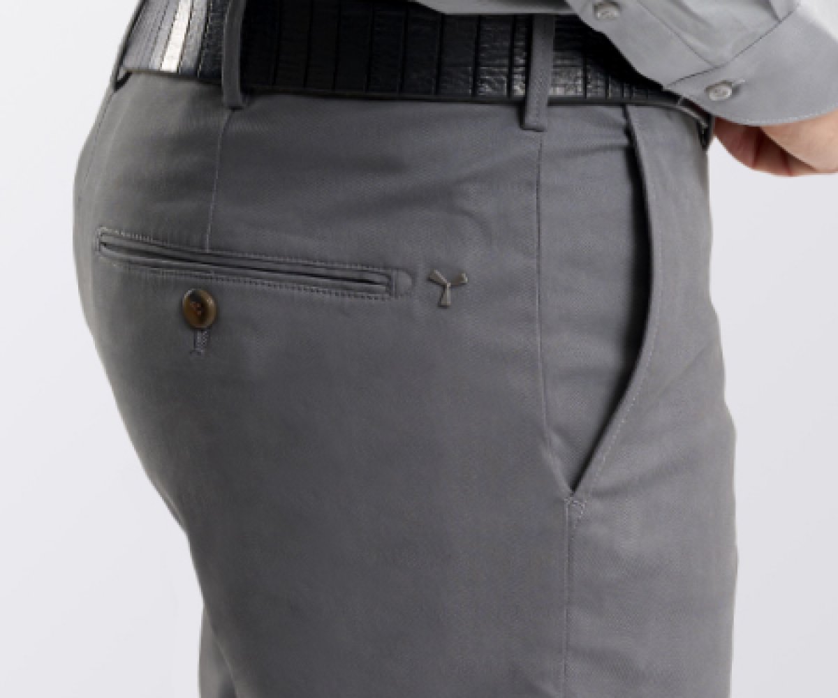 Chinot joustavaa gabardiinia, kapea malli, räätälöidyt vyölenkit, suljetaan vetoketjulla, näkyvissä oleva napitushalkio ja sisäpuolella nappi. 2 saumataskua, 1 piilotasku vyötäröllä. Takana 2 kaksoislistataskua. Propellin muotoinen niitti oikealla puolella.