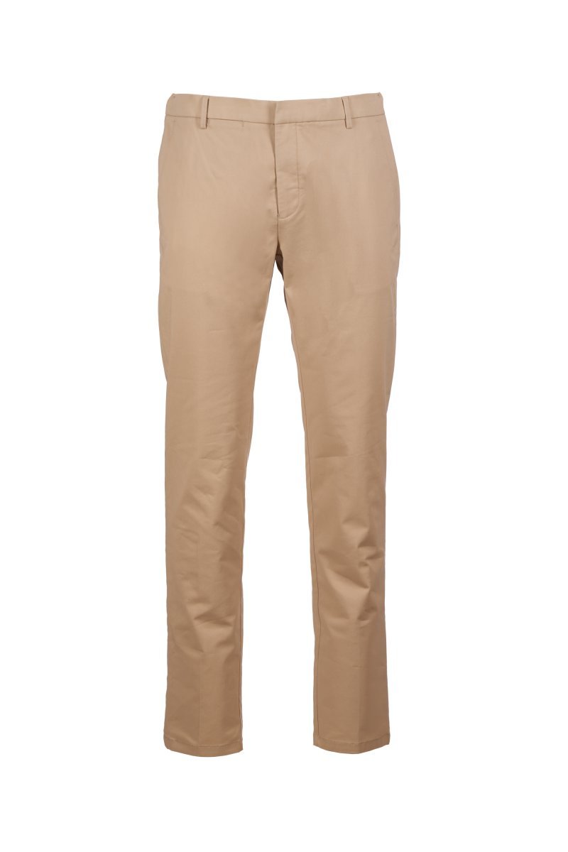 Pantalon chino, en gabardine stretch, coupe contemporaine, avec passants de style sartorial, fermeture par zip, patte de boutonnage cachée avec crochet et bouton intérieurs. 2 poches cavalières, 1 petite poche cachée à la taille, 2 poches arrière à double passepoil et rabat arrondi. Fente en queue d'aronde au dos. Rivet en forme d'hélice sur le côté droit.