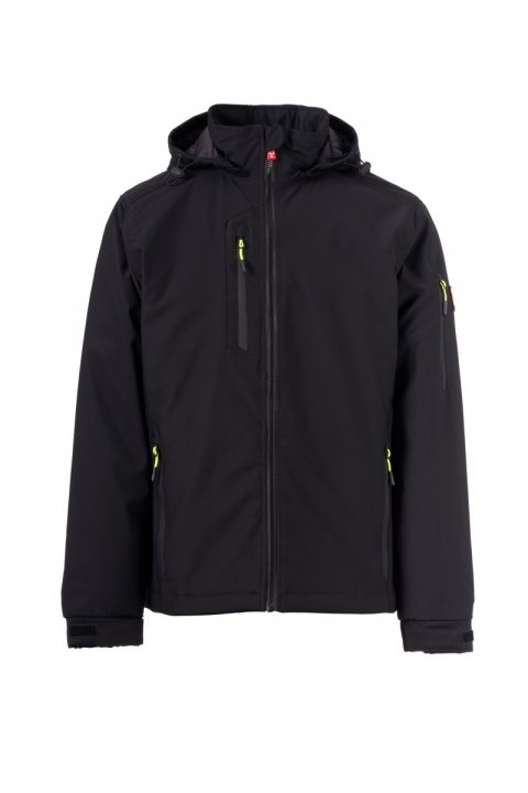 WP 8000 mm H₂O, WVT 5000 g/m² 24 h. Troslojna jakna izrađena od materijala Soft-shell, sa srednjom podstavom (140 g/m²), za muškarce, zatvaranje patentnim zatvaračem SBS s metalnim klizačem sa značajkom poluautomatskog zatvaranja i personaliziranim izvlakačem. Uklonjiva kapuljača s prilagodljivom uzicom za stezanje. Retroreflektirajuće trake na leđima i stražnjoj strani kapuljače. Rastezljive elastične uzice na zapešćima koje se mogu prilagoditi trakom. Dva bočna džepa s patentnim zatvaračem i jedan džep na prsima s presvučenim patentnim zatvaračem i jedan džep na lijevoj ruci s ušivenim držačem za olovke, sa zatvaranjem pomoću patentnog zatvarača. Fluorescentni klizači. Unutarnji džep koji se zatvara čičkom. Prilagodljivo dno s personaliziranim graničnicima.