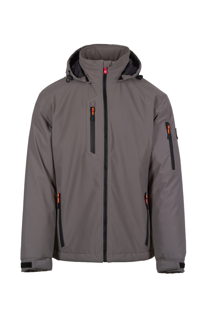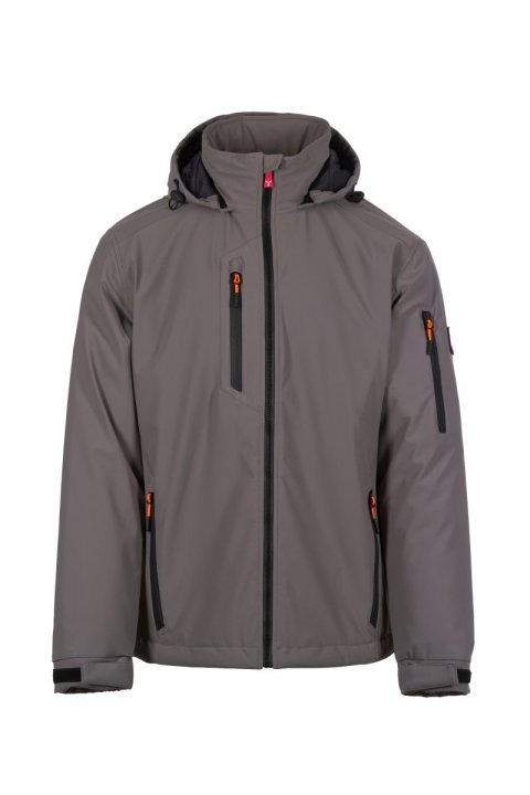 WP 8000 mm H₂O, WVT 5000 g/m² 24 h. Dvoslojna jakna izrađena od materijala Soft-shell, s laganom podstavom (100 g/m²), za muškarce, zatvaranje patentnim zatvaračem SBS s metalnim klizačem sa značajkom poluautomatskog zatvaranja i personaliziranim izvlakačem. Uklonjiva kapuljača s prilagodljivom uzicom za stezanje. Retroreflektirajuće trake na leđima i stražnjoj strani kapuljače. Rastezljive elastične uzice na zapešćima koje se mogu prilagoditi zatvaranjem trakom. Dva bočna džepa s patentnim zatvaračem i jedan džep na prsima s presvučenim patentnim zatvaračem i jedan džep na lijevoj ruci s ušivenim držačem za olovke, sa zatvaranjem pomoću patentnog zatvarača. Fluorescentni klizači. Unutarnji džep koji se zatvara čičkom. Prilagodljivo dno s personaliziranim graničnicima.