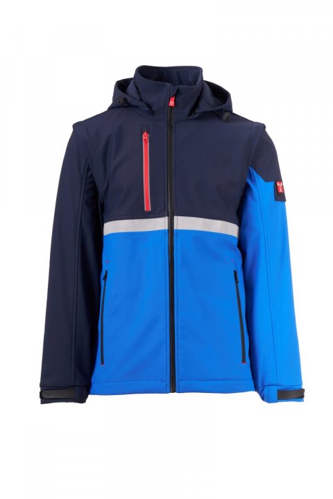 WP 8000 mm H₂O, WVT 5000 g/m² 24 h. Troslojna dvobojna jakna 2-u-1 od materijala Soft-shell za muškarce s odvojivim rukavima. Zatvaranje patentnim zatvaračem SBS s metalnim klizačem sa značajkom poluautomatskog zatvaranja i personaliziranim izvlakačem. Odvojiva kapuljača s prilagodljivom uzicom za stezanje. Prednja retroreflektirajuća traka na prsima. Rastezljive elastične uzice na zapešćima koje se mogu prilagoditi trakom. Dva bočna džepa s patentnim zatvaračem i jedan džep na prsima zatvoren patentnim zatvaračem s retroreflektirajućim detaljem. Element „Life-saving” na leđima, s logotipom od retroreflektirajućeg materijala, zatvara se patentnim zatvaračem. Unutarnji džep za tabletni uređaj koji se zatvara trakom. Prozračna unutarnja podstava na leđima. Prilagodljivo dno s personaliziranim graničnicima.