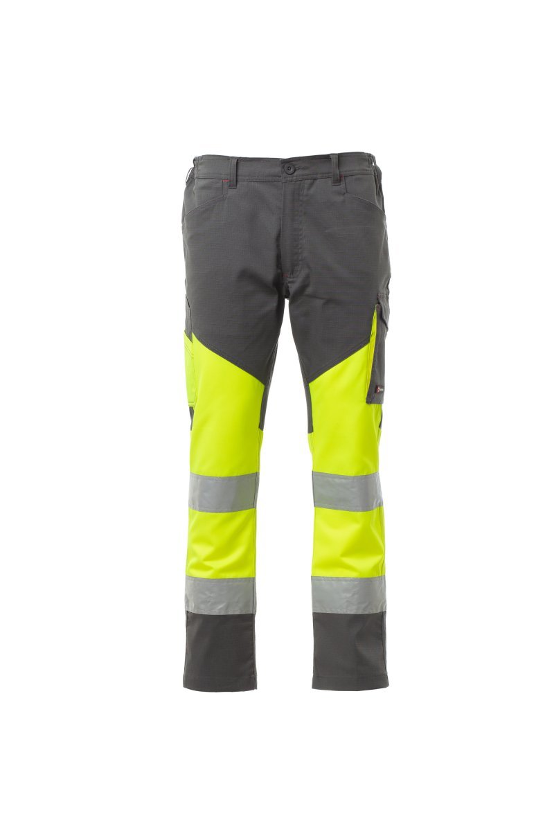 Ljetne hlače, dvobojna, visoke vidljivosti, s retroreflektirajućim trakama, bočnim lastišima i trakicama u struku. Zatvaranje sa zipsom i plastičnim gumbom. Dva prednja oblikovana džepa, jedan bočni džep Lock System, s izvlačivim držačem za bedž, i jedan s dvostrukim držačem za metar. Dva stražnja džepa od kojih jedan s patkom na čičak i jedan s retroreflektirajućim trakama. Šavovi u tonu kontrastne tkanine. Korak i unutrašnja noga s trostrukim šavovima. Međunarodna veličina L ima unutrašnju nogu od 80 cm.