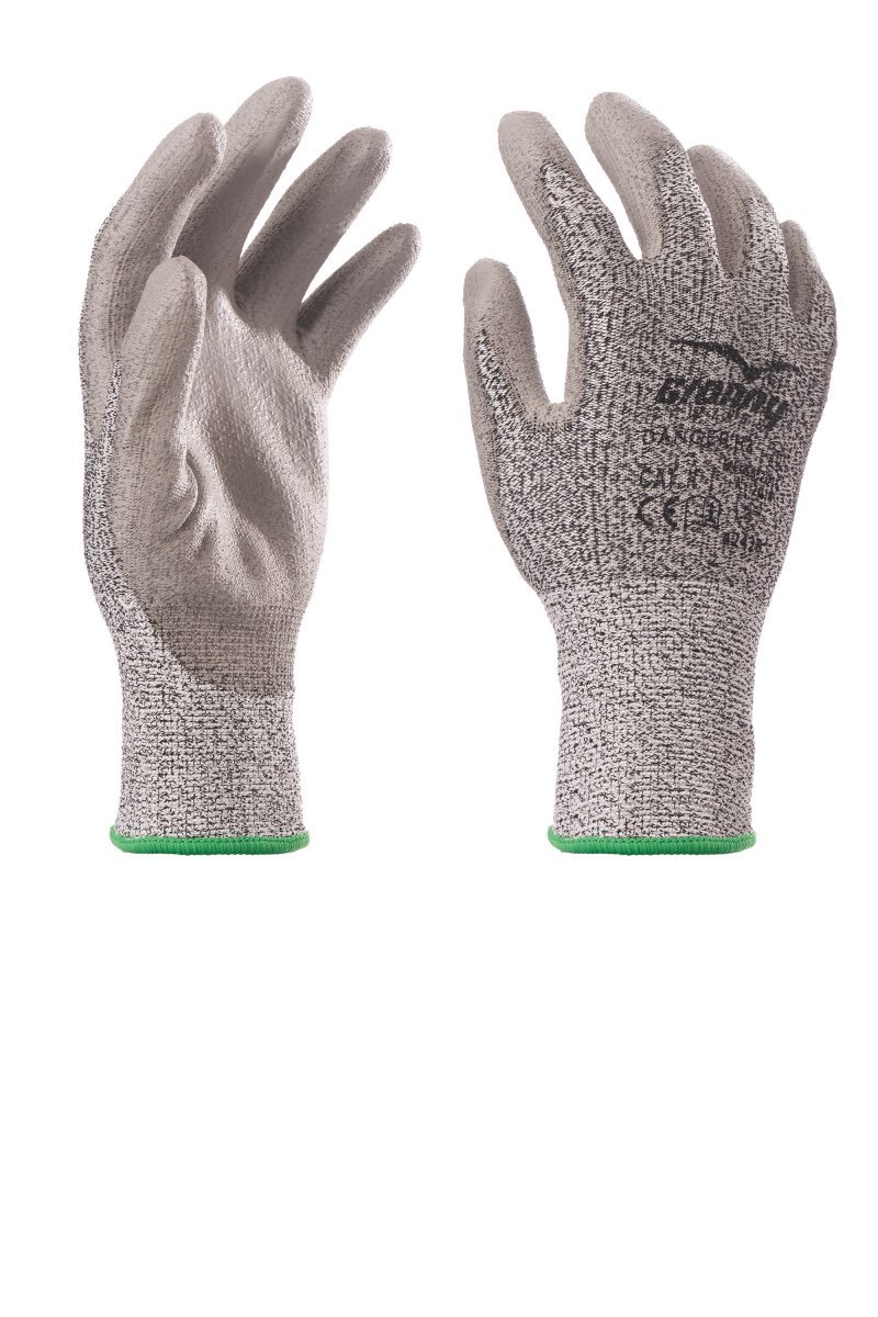 Rukavice sa zaštitom od rezanja izrađene od polietilena 13 G, prozračne sa stražnje strane, s pletenom manžetnom, presvučene poliuretanom. Karakteristike: robusno. Prednosti: otporne na rezanje, prianjanje, preciznost, osjetljivost, udobnost. Područja upotrebe: za rukovanje suhim ili masnim predmetima za rezanje i njihovo sastavljanje. Najmanja jedinica za prodaju: 1 tucet (12 parova). Rub je druge boje ovisno o veličini.