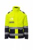 Jó láthatóságot biztosító, kétszínű női kabát fényvisszaverő csíkokkal, műanyag cipzárral és fémhúzókával, amelyet hajtóka és tépőzár fed, elrejthető kapucnival, bevarrott ujjal, állítható , rugalmas mandzsettával, két zipzáras bújtatott első zseb, egy zseb a mellkason jelvénytartóval, hajtókával és tépőzárral. Nem kivehető bélelt belső rész, polár gallérral és vállakkal, egy belső zsebbel. Hegesztett varratok.