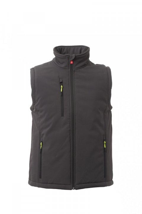 WP 8000 mm H₂O, WVT 5000 g/m² 24h. 3 rétegű férfi softshell mellény meleg béléssel (160 g/m2), cipzárral, „félautomata” (fékezős) fém cipzárkocsival és egyedi fogóval. A gallérbélésen oldalt polár részletek. Két oldalsó cipzáras zseb, egy cipzáras mellzseb. Tépőzárral állítható rugalmas mandzsetta. Fluoreszkáló fogók. Két belső zseb, az egyik formázott és cipzáras, a másik egy tépőzáras tablettartó. Állítható alsó rész egyedi zsinórszabályozóval.