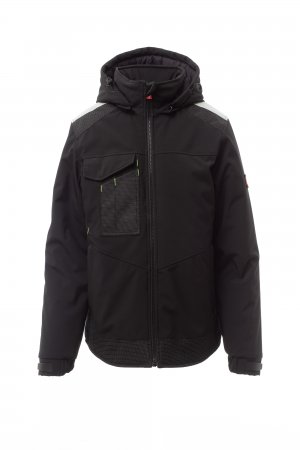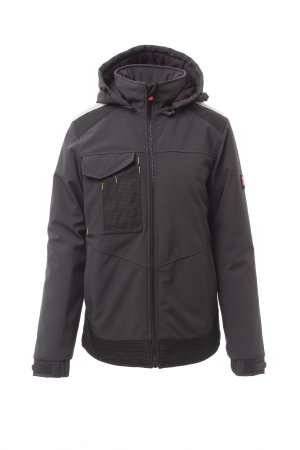 WP 8000 mm H₂O, WVT 5000 g/m² 24h bélelt férfi softshell polárbetétes gallérral, „félautomata” (fékezős) cipzár fém cipzárkocsival és egyedi húzókával. Levehető kapucni állítható húzózsinórral. A vállán fényvisszaverő sáv. Tépőzárral állítható rugalmas mandzsetta. Lock System rendszerű mellzseb hajtókával és tolltartóval. Két oldalsó cipzáras zseb. Két belső zseb, az egyik tépőzáras tablettartóval, a másik cipzáras, a mellrész jobb oldalán. Alul egyedi szűkítő zsinórral és a hátán fényvisszaverő szegéllyel.