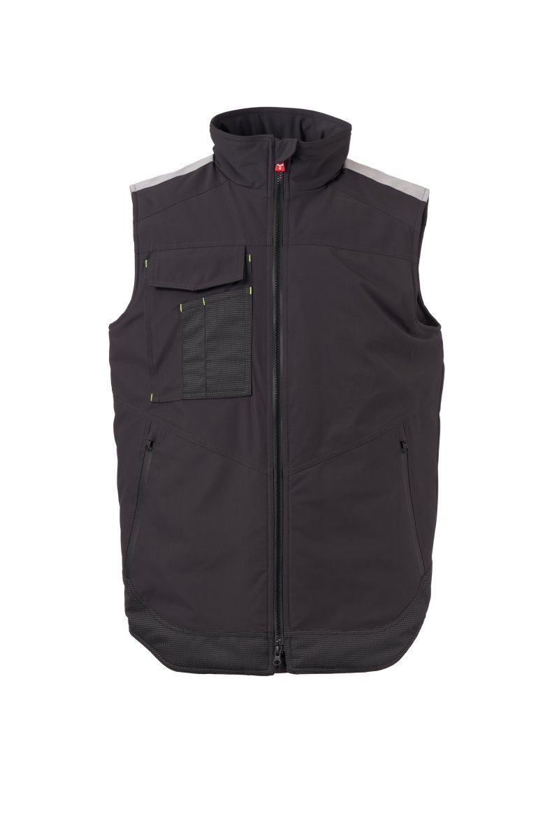 WP 8000 mm H₂O, WVT 5000 g/m² 24h. 3 rétegű férfi softshell mellény közepesen meleg béléssel (140 g/m2), SBS cipzár „félautomata” (fékezős) fém cipzárkocsival és egyedi fogóval. Fényvisszaverő sáv a vállon. Lock System biztonsági rendszerű mellzseb hajtókával, jelvénytartóval és tolltartóval. Két oldalsó zseb rejtett cipzárral. A háton „életmentő" biztonsági elem, belső fényvisszaverő logóval, vízlepergető anyaggal bevont cipzárral. Két belső zseb, a mellkas jobb oldalán lévő formázott és cipzáras, a bal oldali tépőzáras, tablettartóval. Állítható alsó rész egyedi zsinórszabályozóval. Fényvisszaverő hatású, pöttyös anyag.