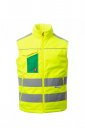 Bélelt mellény nagy láthatósággal, visszaverő szalagokkal vállakon és törzsön. Belső polár gallér. Fém zipzárkocsis“semi-auto lock” záródás személyre szabott cipzárkihuúzóval. Egy többfunkciós kétszínű mellzseb jelvénytartó kampóval és Lock System záródású szorítóval. Két külső zseb cipzárral. Egy belső zseb tépőzáras záródással.