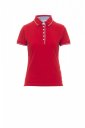 Női rövid ujjú, karcsúsított pólóing 6 fehér gombbal, Oxford kék színű belső gallér, hajtóka és oldalsó szellőzők, bordázott gallér és ujjszegély enyhén kontrasztos díszítéssel, hónaljnál lyuggatott, oldalsó szellőzők megerősített varratokkal, oldalsó anyagerősítés, sztreccsvarratok, anyagerősítés a nyakrész belső oldalán