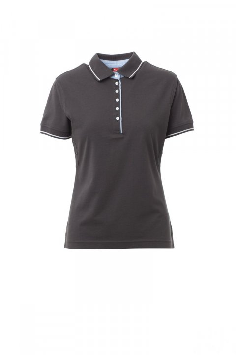Női rövid ujjú, karcsúsított pólóing 6 fehér gombbal, Oxford kék színű belső gallér, hajtóka és oldalsó szellőzők, bordázott gallér és ujjszegély enyhén kontrasztos díszítéssel, hónaljnál lyuggatott, oldalsó szellőzők megerősített varratokkal, oldalsó anyagerősítés, sztreccsvarratok, anyagerősítés a nyakrész belső oldalán