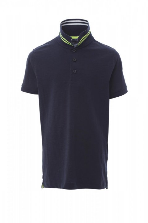 Gyermek rövid ujjú pólóing 3, színben illeszkedő, gyöngyházhatású gombbal, galléron kontrasztos színű csíkok, alján pedig fluoreszkáló csíkok, bordázott gallér és ujjszegély, jobb ujjon díszítés, oldalsó szellőzők és bújtatott varrás a gallérnál fluoreszkáló anyagerősítéssel, transzfernyomásos címke.