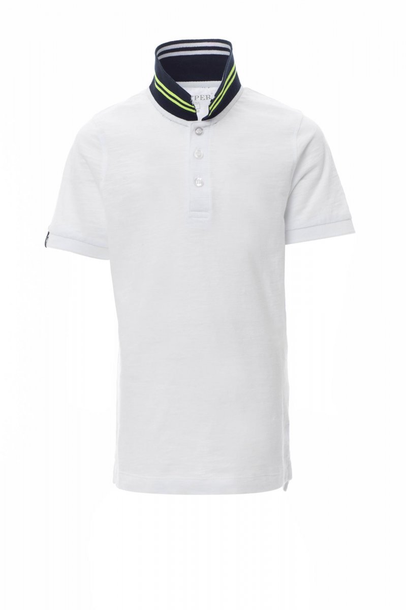 Gyermek rövid ujjú pólóing 3, színben illeszkedő, gyöngyházhatású gombbal, galléron kontrasztos színű csíkok, alján pedig fluoreszkáló csíkok, bordázott gallér és ujjszegély, jobb ujjon díszítés, oldalsó szellőzők és bújtatott varrás a gallérnál fluoreszkáló anyagerősítéssel, transzfernyomásos címke.