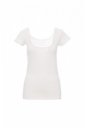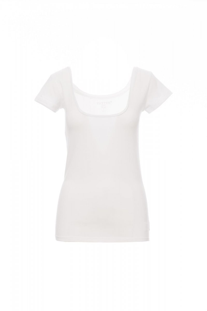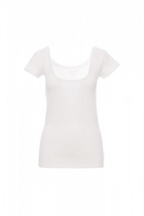 Női rövid ujjú, kocka nyakú, karcsúsított póló 1 cm-es nyakrésszel, oldalvarratokkal.