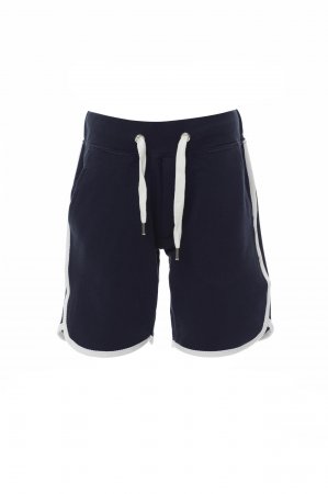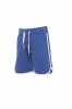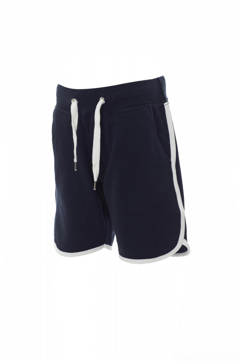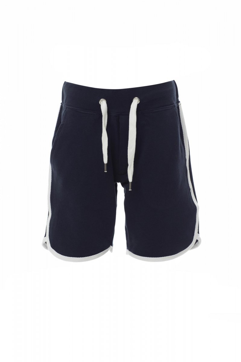 Bermuda kialakítású, rövidszárú melegítőnadrág gyermekeknek sztreccsanyaggal a derékrészen és állítózsinórral, cipzáras slicc, két elülső zseb és kontrasztos színű díszítés.