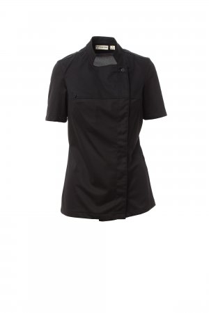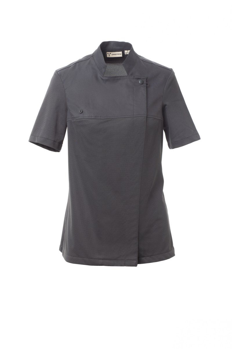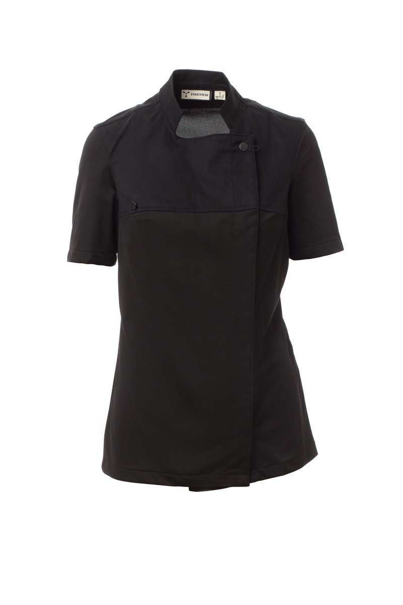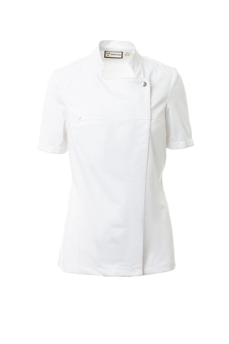 Szakácskabát mandarin gallérral, pamut twill és Lycra® T400® anyagból, kiváló rugalmas és légáteresztő tulajdonságokkal és kényelmes hálós anyaggal a háton, a mandzsettánál és a deréknál, hogy fokozza a légáteresztő képességet. Dupla soros záródás pattintható gombokkal, kihajtható szárny, mely egy szabadon álló gomb rögzítésével a mellkasra rögzíthető, mely a személyre szabott hajtóka és az innovatív V-nyak hatását kelti. Rövid ujjú, szegéllyel.