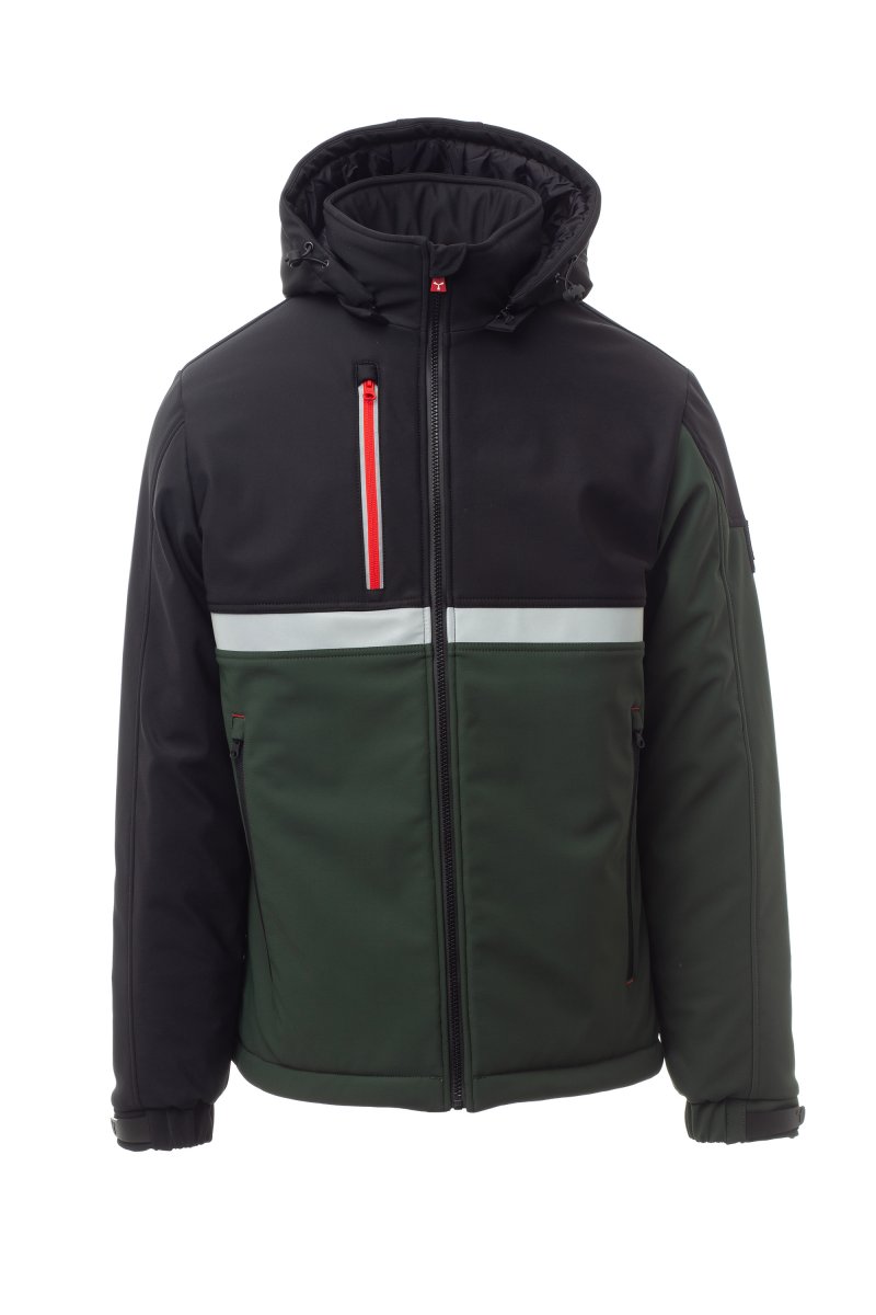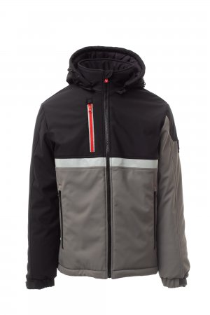 WP 8000 mm H₂O, WVT 5000 g/m² 24h. Þriggja laga skeljakki (soft-shell) fyrir karla með hlýrri fóðrun (160g/m²), SBS-rennilás með „hálfsjálfvirkum“ málmsleða og sérsniðnu málmstykki til að toga í. Hetta sem hægt er að taka af með bandi sem hægt er að stilla. Endurskinsrönd framan á bringu. Teygjanlegt stroff með frönskum rennilás og innra stroff. Tveir hliðarvasar sem lokað er með rennilás og brjóstvasi með rennilás og endurskinsmerkingum. Öryggiseining (life-saving) á baki með innfelldu endurskinsmerki, lokað með frönskum rennilás. Tveir innri vasar: einn á hægra brjósti með rennilás og einn vasi fyrir spjaldtölvu með frönskum rennilás vinstra megin. Neðsti hluti jakkans er stillanlegur með sérsniðnum stoppurum.