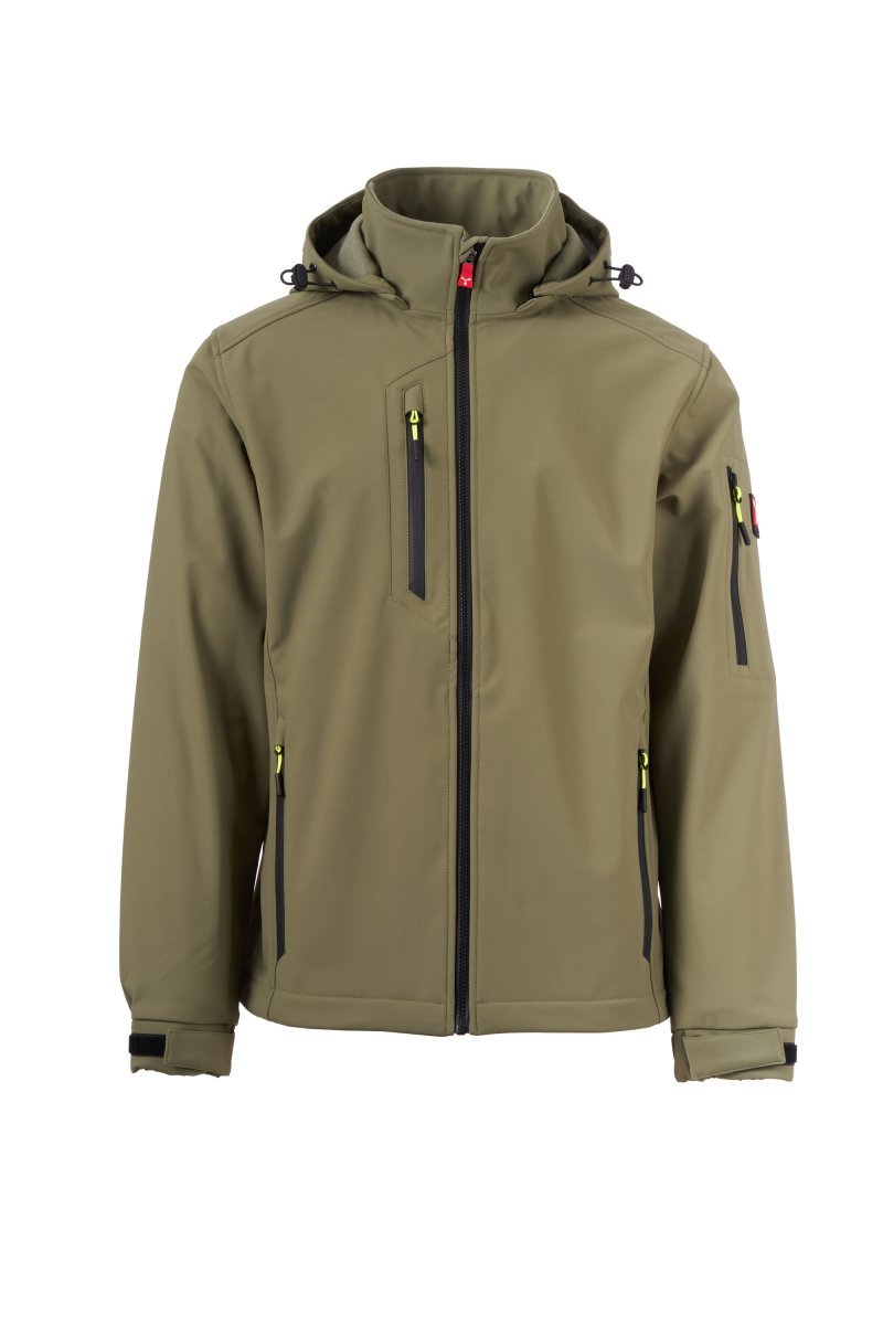 WP 8000 mm H₂O, WVT 5000 g/m² 24h. Léttfóðraður skeljakki (soft-shell) fyrir karla með SBS-rennilás með „hálfsjálfvirkum“ málmsleða og sérsniðnu stykki til að toga í. Hetta sem hægt er að taka af með bandi sem má stilla eftir þörfum. Endurskinsrendur á neðra baki og aftan á hettunni. Teygjanlegt stroff á ermum sem hægt er að stilla með riflás. Tveir hliðarvasar með rennilás, brjóstvasi með rennilás með varnarhlíf og vasi á vinstri handlegg með pennahólfi, lokað með rennilás. Togstykki með endurskini. Einn innri vasi með riflás. Neðsti hluti jakkans er stillanlegur með sérsniðnum stoppurum.