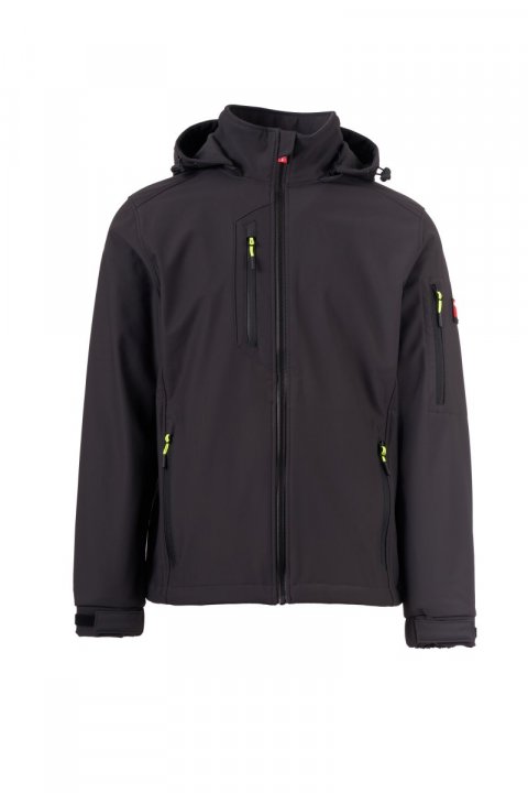 WP 8000 mm H₂O, WVT 5000 g/m² 24h. Léttfóðraður skeljakki (soft-shell) fyrir karla með SBS-rennilás með „hálfsjálfvirkum“ málmsleða og sérsniðnu stykki til að toga í. Hetta sem hægt er að taka af með bandi sem má stilla eftir þörfum. Endurskinsrendur á neðra baki og aftan á hettunni. Teygjanlegt stroff á ermum sem hægt er að stilla með riflás. Tveir hliðarvasar með rennilás, brjóstvasi með rennilás með varnarhlíf og vasi á vinstri handlegg með pennahólfi, lokað með rennilás. Togstykki með endurskini. Einn innri vasi með riflás. Neðsti hluti jakkans er stillanlegur með sérsniðnum stoppurum.