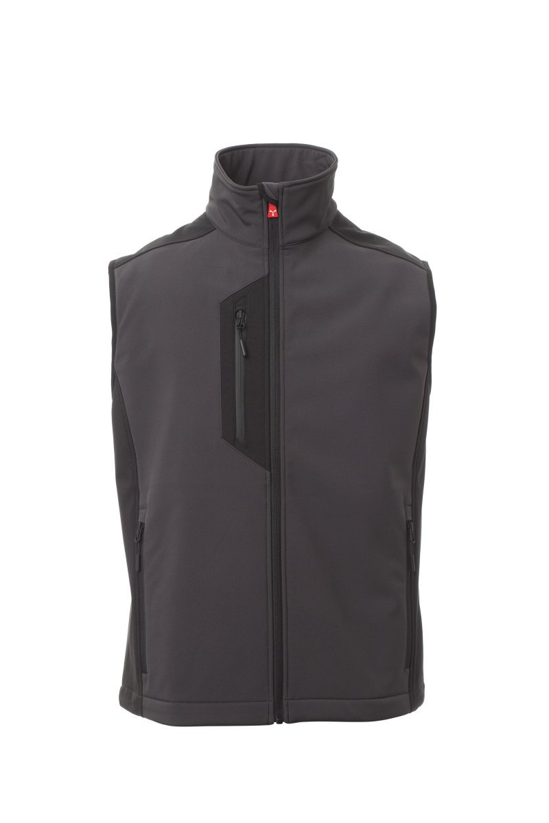 WP 8000 mm H₂O, WVT 5000 g/m² 24h. Tvílitt þriggja laga skelvesti (soft-shell) fyrir karla, rennilás með „hálfsjálfvirkum“ málmsleða og sérsniðnu stykki til að toga í. Tveir hliðarvasar með rennilás, einn brjóstvasi með rennilás með varnarhlíf. Endurskinsbryddingar á berustykki á baki. Neðsti hluti jakkans er stillanlegur með sérsniðnum stoppurum.