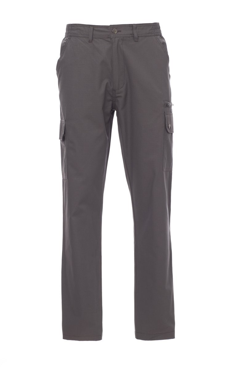 Buxur fyrir karla úr léttu teygjuefni með rifvörn, teygjanlegar á hliðum, beltislykkjur í mitti. Rennilás með málmhnappi, tveir vasar að framan, tveir venjulegir hliðarvasar með flipum og smellum, einn vinstri vasi með rennilás, einn málbandsvasi hægra megin, tveir innfelldir rassvasar með hnappi og hnappagati.