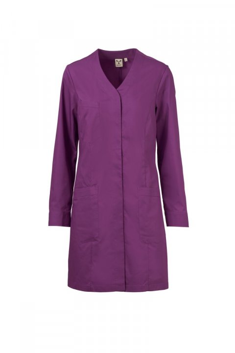 Langerma vinnusloppur með V-hálsmáli fyrir konur, úr bómullarpoplíni, pólýester og Lycra® T400®, sérlega teygjanlegur og með frábærri öndun. Tauhnappar fyrir miðju, langar ermar og ermalíningar með smelluhnöppum.  Þrír bótavasar: einn á bringunni; tveir neðar, annar með hinu þekkta tvílita Payper-skrúfulógói ísaumuðu, og innri vasi með snjallsímahaldara. Miðjuskurður að aftan og á hliðum. Klauf neðst til að auka hreyfanleika.