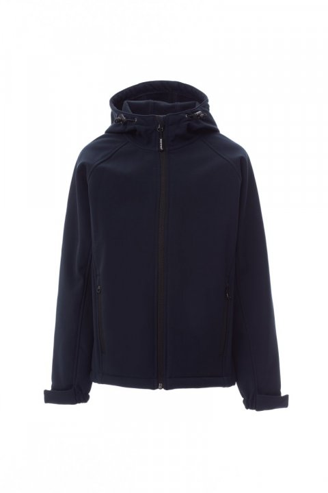 WP 8000 mm H₂O, WVT 5000 g/m² 24h. Soft-shell 3 strati, da bambino, manica raglan, chiusura tramite zip SBS nastrata con cursore in metallo. Cappuccio sagomato con due cuciture e coulisse con stopper. Polsini elasticizzati, regolabili con stringipolso a strappo. Due tasche esterne con zip.