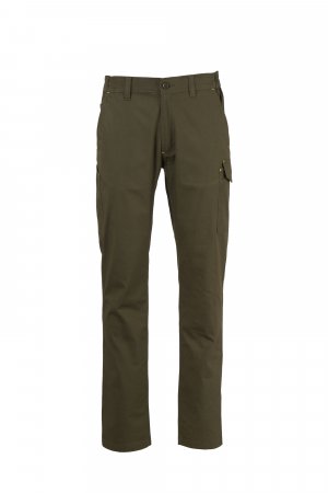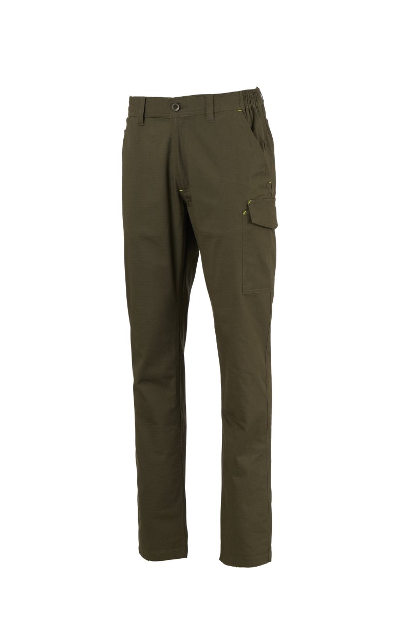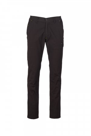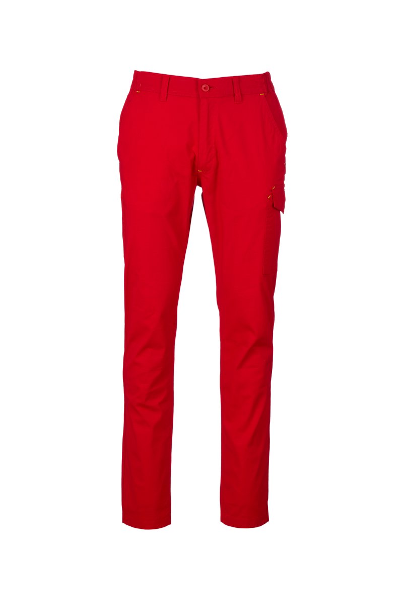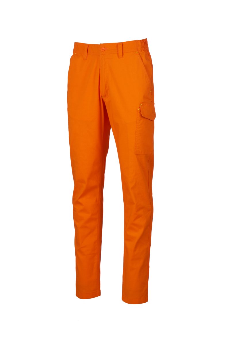 Kelnės, pagamintos iš lengvos, tamprios ir neplyštančios medžiagos, su diržo kilpomis ir elastingu juosmeniu, atvartu su užtrauktuku ir sagute ant diržo. Klasikinio kirpimo priekinės kišenės su kišene monetoms dešinėje drabužio kišenėje, kai dėvimas, ir šoninis matavimo juostos laikiklis. Kairės pusės šoninė kišenė su UŽRAKTO SISTEMOS uždarymo atvartu. Dvi užpakalinės kišenės, iš kurių viena su atvartu ir lipuku.
