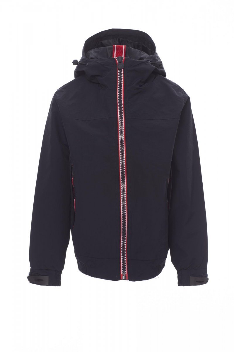 Bērnu jaka ar 8 mm kontrastējošu rāvējslēdzēju, formīga kapuce ar divām vīlēm un savilcēju, elastīgs viduklis, elastīgas aproces un gumijota, regulējama plaukstas aizdare, divas ārējas kabatas ar apslēptu rāvējslēdzēju. Bez polsterējuma, tīklveida odere, viena iekšējā viedtālruņa kabata ar rāvējslēdzēju un atveri austiņām, rāvējslēdzējs uz krūtīm un muguras vieglākai apdrukai un izšūšanai.