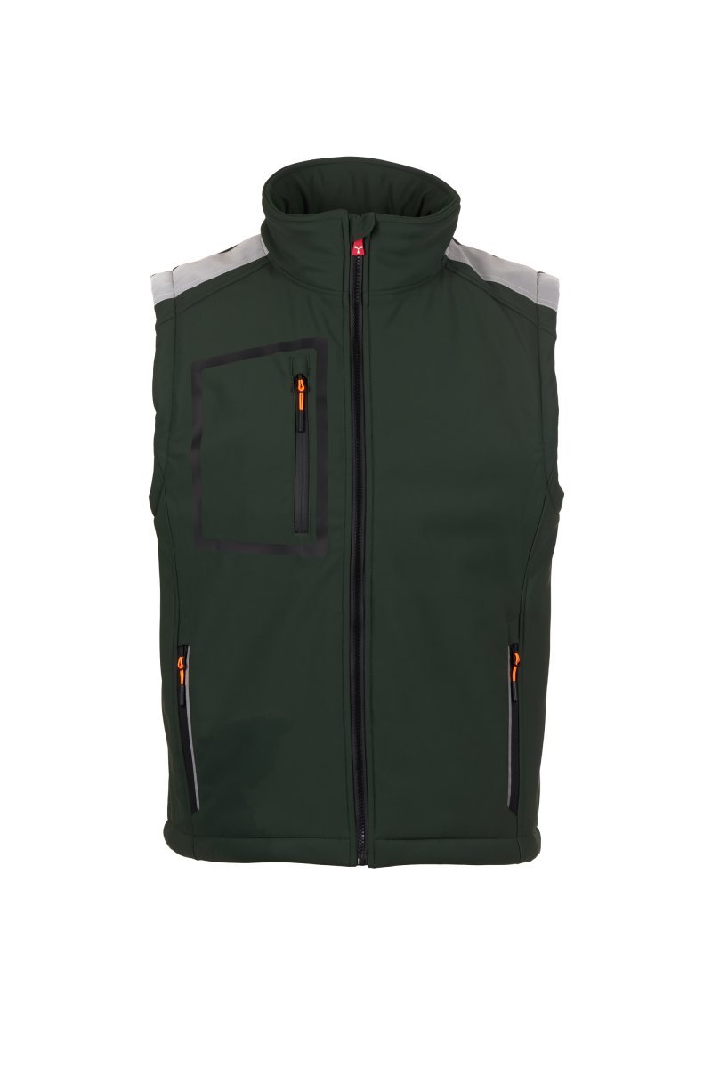 Ūdens necaurlaidība 8000 mm H₂O, ūdens tvaika vadīšanas ātrums 5000 g/m² 24 h. Trīs slāņu Softshell vīriešu veste ar siltu polsterējumu (160 g/m²), kurai ir polārflīsa ieliktņi apkaklē, SBS rāvējslēdzējs ar metāla vai pielāgoto aizdari un daļējas bloķēšanas funkciju. Apkakles odere ar polārflīsa elementiem sānos. Uz plecu daļas un muguras lejasdaļas — atstarojošas līnijas. Piekausēta krūšu kabata, kas aizdarāma ar rāvējslēdzēju, kuram ir īpašs pārklājums. Divas sānu kabatas, kas aizdarāmas ar atstarojošu rāvējslēdzi. Fluorescējoši striķu savilcēji. Divas iekškabatas: viena formēta krūšu kabata ar rāvējslēdzēju labajā pusē un viena planšetei paredzēta kabata kreisajā pusē, kas aizdarāma ar līplenti. Apakšmalā auklu savilcēji ar pielāgotiem bloķētājiem.