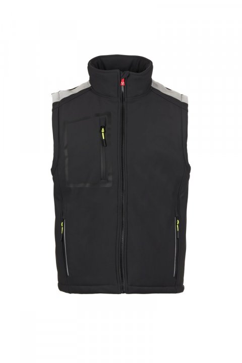 Ūdens necaurlaidība 8000 mm H₂O, ūdens tvaika vadīšanas ātrums 5000 g/m² 24 h. Trīs slāņu Softshell vīriešu veste ar siltu polsterējumu (160 g/m²), kurai ir polārflīsa ieliktņi apkaklē, SBS rāvējslēdzējs ar metāla vai pielāgoto aizdari un daļējas bloķēšanas funkciju. Apkakles odere ar polārflīsa elementiem sānos. Uz plecu daļas un muguras lejasdaļas — atstarojošas līnijas. Piekausēta krūšu kabata, kas aizdarāma ar rāvējslēdzēju, kuram ir īpašs pārklājums. Divas sānu kabatas, kas aizdarāmas ar atstarojošu rāvējslēdzi. Fluorescējoši striķu savilcēji. Divas iekškabatas: viena formēta krūšu kabata ar rāvējslēdzēju labajā pusē un viena planšetei paredzēta kabata kreisajā pusē, kas aizdarāma ar līplenti. Apakšmalā auklu savilcēji ar pielāgotiem bloķētājiem.