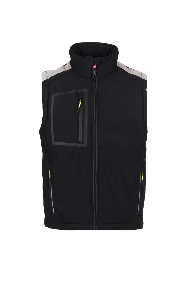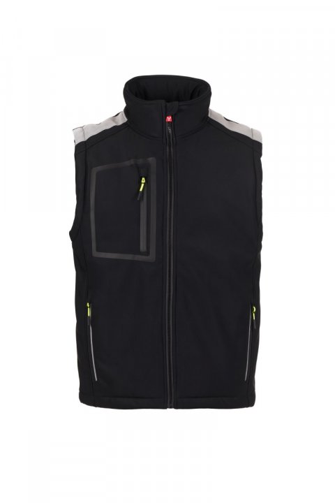 Ūdens necaurlaidība 8000 mm H₂O, ūdens tvaika vadīšanas ātrums 5000 g/m² 24 h. Trīs slāņu Softshell vīriešu veste ar siltu polsterējumu (160 g/m²), kurai ir polārflīsa ieliktņi apkaklē, SBS rāvējslēdzējs ar metāla vai pielāgoto aizdari un daļējas bloķēšanas funkciju. Apkakles odere ar polārflīsa elementiem sānos. Uz plecu daļas un muguras lejasdaļas — atstarojošas līnijas. Piekausēta krūšu kabata, kas aizdarāma ar rāvējslēdzēju, kuram ir īpašs pārklājums. Divas sānu kabatas, kas aizdarāmas ar atstarojošu rāvējslēdzi. Fluorescējoši striķu savilcēji. Divas iekškabatas: viena formēta krūšu kabata ar rāvējslēdzēju labajā pusē un viena planšetei paredzēta kabata kreisajā pusē, kas aizdarāma ar līplenti. Apakšmalā auklu savilcēji ar pielāgotiem bloķētājiem.