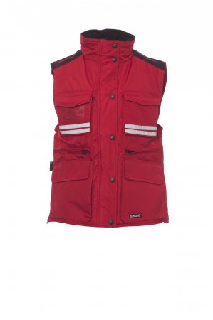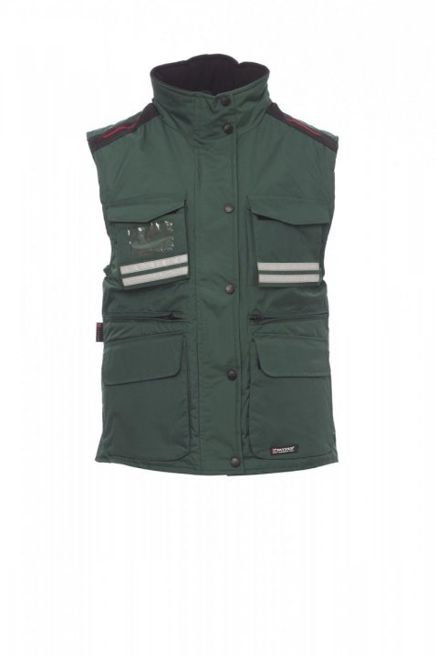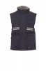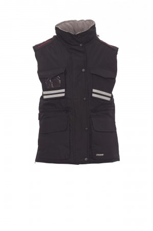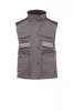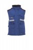 Sieviešu komfortabla pieguļoša veste, 8 mm plastmasas rāvējslēdzējs ar metāla kuģīti, ar atloka aizdari un plastmasas pogām, noņemama un/vai nolokāma formīga kapuce, pelēkas atstarojošas svītras priekšpusē un aizmugurē, sānu ventilācijas atvere ar rāvējslēdzēju, deviņas ārējās kabatas, divas ar LOCK SYSTEM, divas ar rāvējslēdzēju un pastiprinātu iekšpusi, viena ar apgriežamu apliecības turētāju. Polsterēta, apkakle, aizmugures un muguras lejasdaļas sildītājs no mikroflīsa, iekšējais savilcējs un rāvējslēdzējs vieglākai apdrukai un izšūšanai.