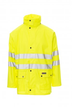 Augstas redzamības pret nokrišņiem izturīga jaka ar 3M svītrām. Augstā apkakle, ielokāma kapuce ar savelkamo auklu, reglāna piedurknes, taisna piedurknes šuve, iekšējie elastīgie trikotāžas piedurknes gali. Aiztaisāma ar neilona rāvējslēdzēju un pārloku, kam ir slēptas spiedpogas. Apakšā savelkama aukla. Karsti līmētās svītras un šuves. Paredzēta tikai fluorescējošam audumam ar divām atstarojošām svītrām ap krūtīm un rokām.