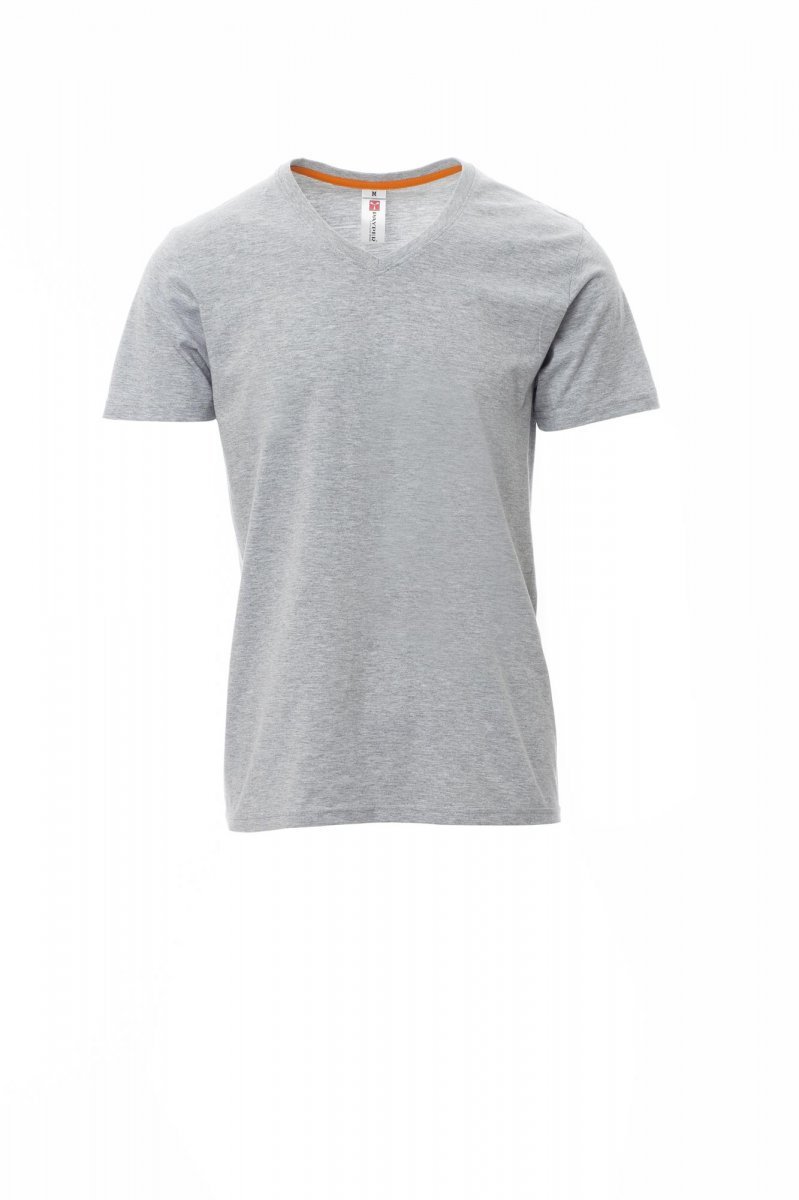 Men’s short-sleeved V neck t-shirt, with 1.5 cm spandex mix rib neckband with top stitching on the front, contrasting shoulder-to-shoulder reinforcement tape visible on the inside collar, stretch seams, tubular design.