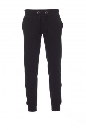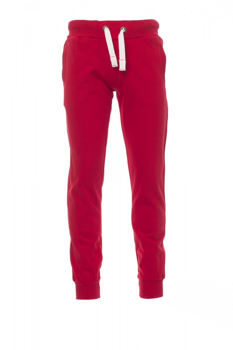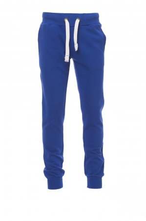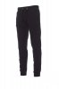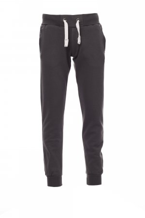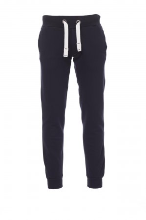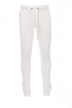 Vīriešu sporta bikses ar izstieptu rievojumu jostasvietā un kāju apakšdaļā, rāvējslēdzēja aizdare, balts savilcējs ar kontrastējošu izšuvumu un metāla gredzeniem, divas priekškabatas ar rievojumu un aizmugurējā kabata, ar rāvējslēdzēja aizdari un pastiprinātām vīlēm.