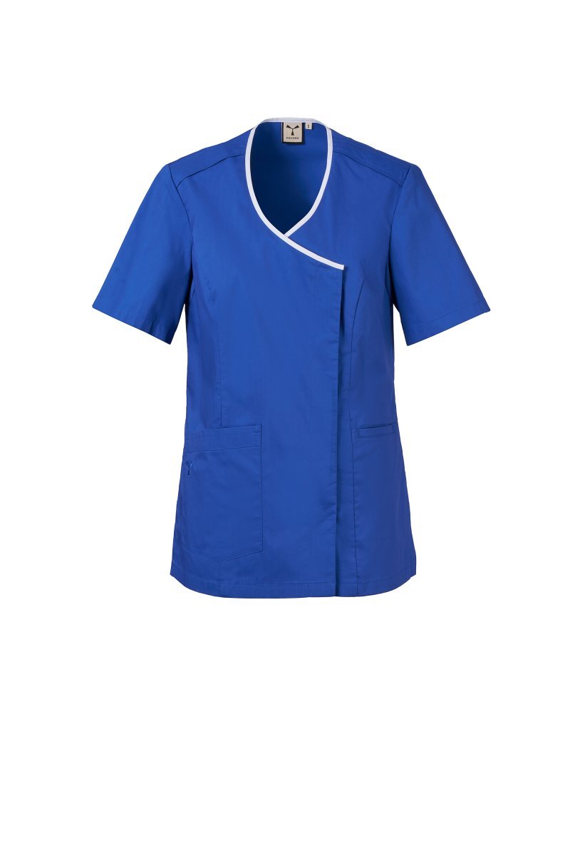 Sieviešu darba mētelis ar īsām piedurknēm, izgatavots no kokvilnas poplīna, poliestera un Lycra® T400®, ar izcilu elastību un gaisa caurlaidību. V veida izgriezums ar kontrastējošas krāsas vīli. Aizdare ar slēptām spiedpogām un viegls tīkliņveida audums zem piedurknes apdares, lai veicinātu gaisa caurlaidību. Divas zemas kabatas: viena ar izgriezumu un viena uzšūta ar raksturīgo divtoņu propellera izšuvumu. Sānu šķēlumi un ieloces aizmugurē.