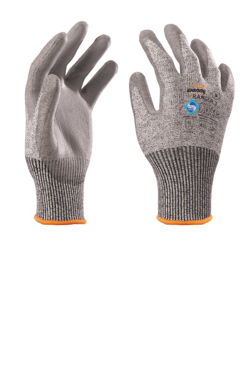 Pret sagriešanu noturīgi 13G HPPE šķiedras cimdi, trikotāžas aproce, poliuretāna plaukstas pārklājums. Īpašības: izturīgi. Stiprās puses: C līmeņa noturība pret griezumiem (TDM griezums)/A3 (ANSI/ISEA), komforts, saķere, jutība, precizitāte. Pielietojums: asu, sausu vai nedaudz eļļainu priekšmetu apstrāde un montāžas darbi. Minimālā pārdodāmā vienība: 1 ducis (12 pāri). Malas krāsa atšķiras atkarībā no izmēra.