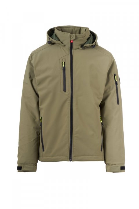 WP 8000 mm H₂O, WVT 5000 g/m² 24h. Машка „soft-shell“ јакна од 3 слоја со средна подлога (140 g/m²), со затворање со SBS патент со метален лизгач со функција на полуавтоматско заклучување и персонализиран влечкач. Отстранлива капуљача со прилагодлива врвка. Ретрорефлектирачки ленти на долниот дел од грбот и на задниот дел од капуљачата. Еластични манжетни, прилагодливи со чичак. Два странични џеба со патент, еден џеб на градите со водоотпорен патент и еден џеб на левиот ракав со интегриран држач за пенкала, затворен со патент. Флуоресцентни влечкачи. Внатрешен џеб со хоризонтален отвор, со затворање на чичак. Долен дел прилагодлив со персонализирани стопери.