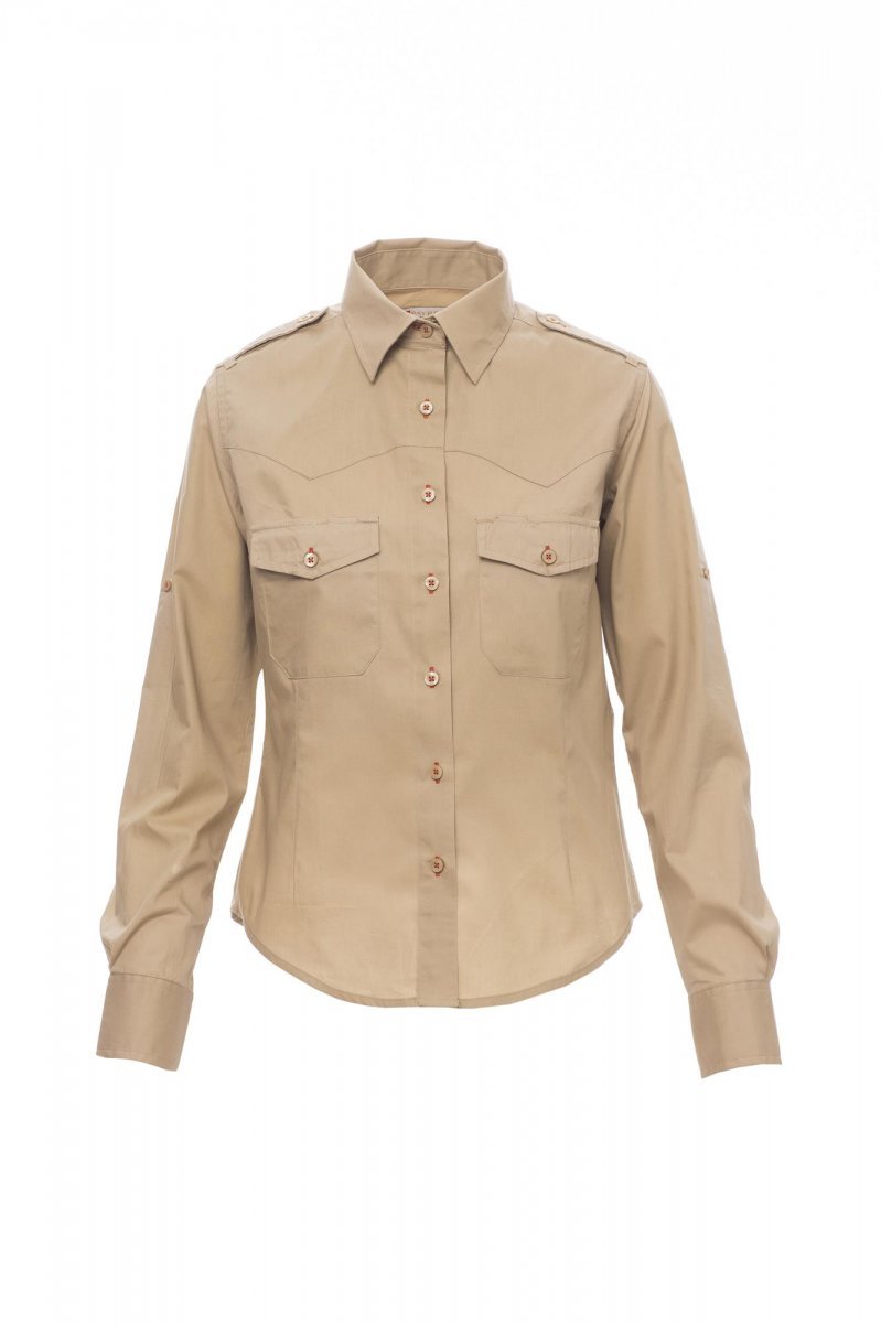 Женска кошула од фино ткаен памук, малку струкирана, платка напред, затворање со копчиња во боја и отвори за копчиња во контрастна боја, еполети, два џебови на градите со поклопка и отвори за пенкало, јазиче и копче на ракавите за практично завртување. Белата кошула нема отвори со контрастна боја и платка на предната страна. Лесно-одржлив материјал.