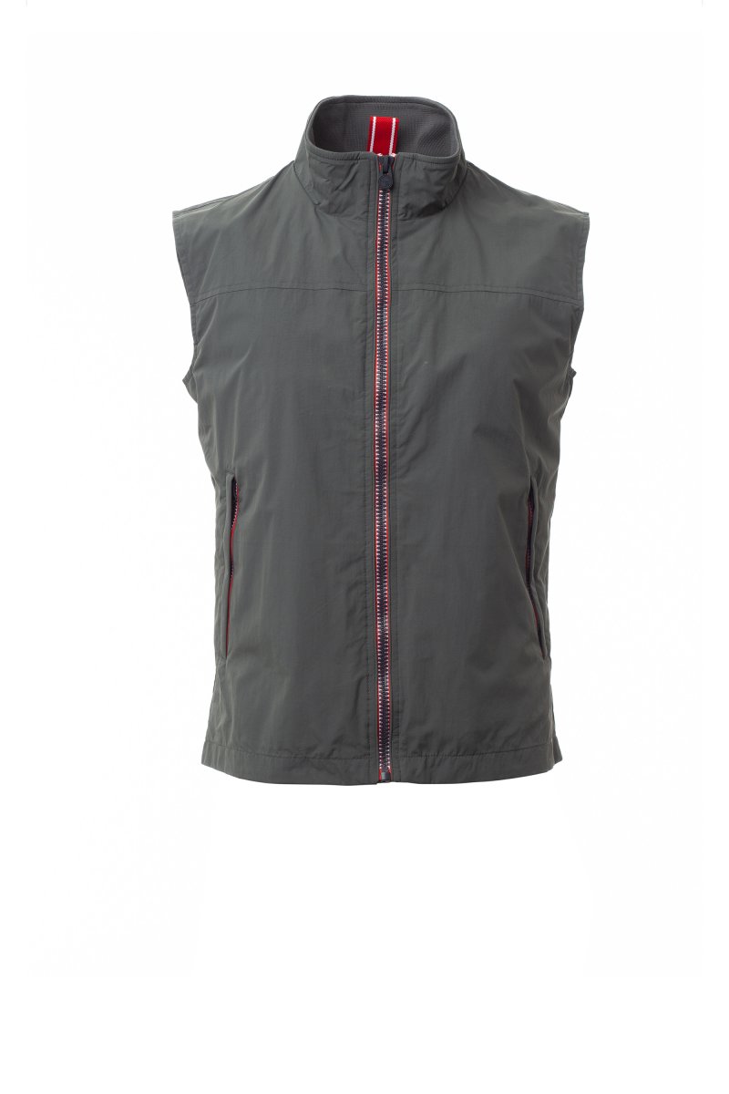 Vest til herre, 8 mm kontrastglidelås, to ytterlommer med skjult glidelås. Upolstret nettingfôr, én indre glidelåslomme med åpning for hodetelefoner til smarttelefon, glidelås på brystet og nederst for lettere trykk og brodering.