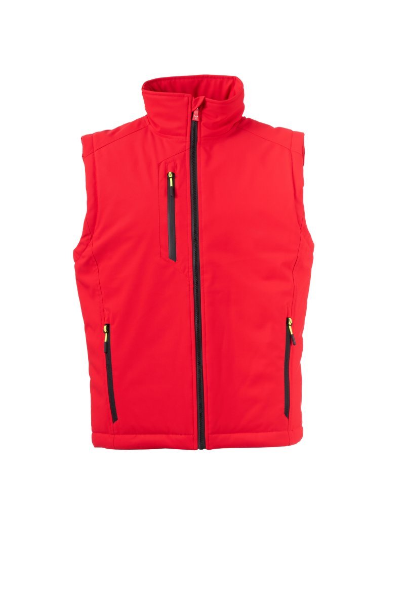 WP 8000 mm H₂O, WVT 5000 g/m² 24 t. Trelags, soft-shell-vest med midels polstring (140g/m²) til herre, SBS-glidelåslukking med «semi-auto lock»-metallglider og tilpasset trekker. Refleksstripe på korsrygg. To sidelommer med glidelås, en brystlomme med belagt glidelås. Fluorescerende trekkere. En innvendig passlomme med borrelåslukking. Justerbar kant med tilpassede stoppere.