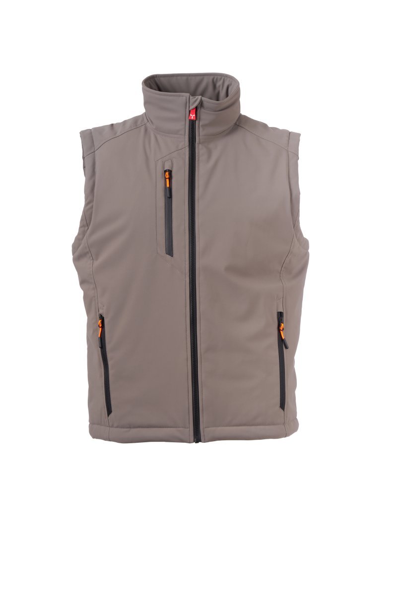 WP 8000 mm H₂O, WVT 5000 g/m² 24 t. Trelags, soft-shell-vest med midels polstring (140g/m²) til herre, SBS-glidelåslukking med «semi-auto lock»-metallglider og tilpasset trekker. Refleksstripe på korsrygg. To sidelommer med glidelås, en brystlomme med belagt glidelås. Fluorescerende trekkere. En innvendig passlomme med borrelåslukking. Justerbar kant med tilpassede stoppere.