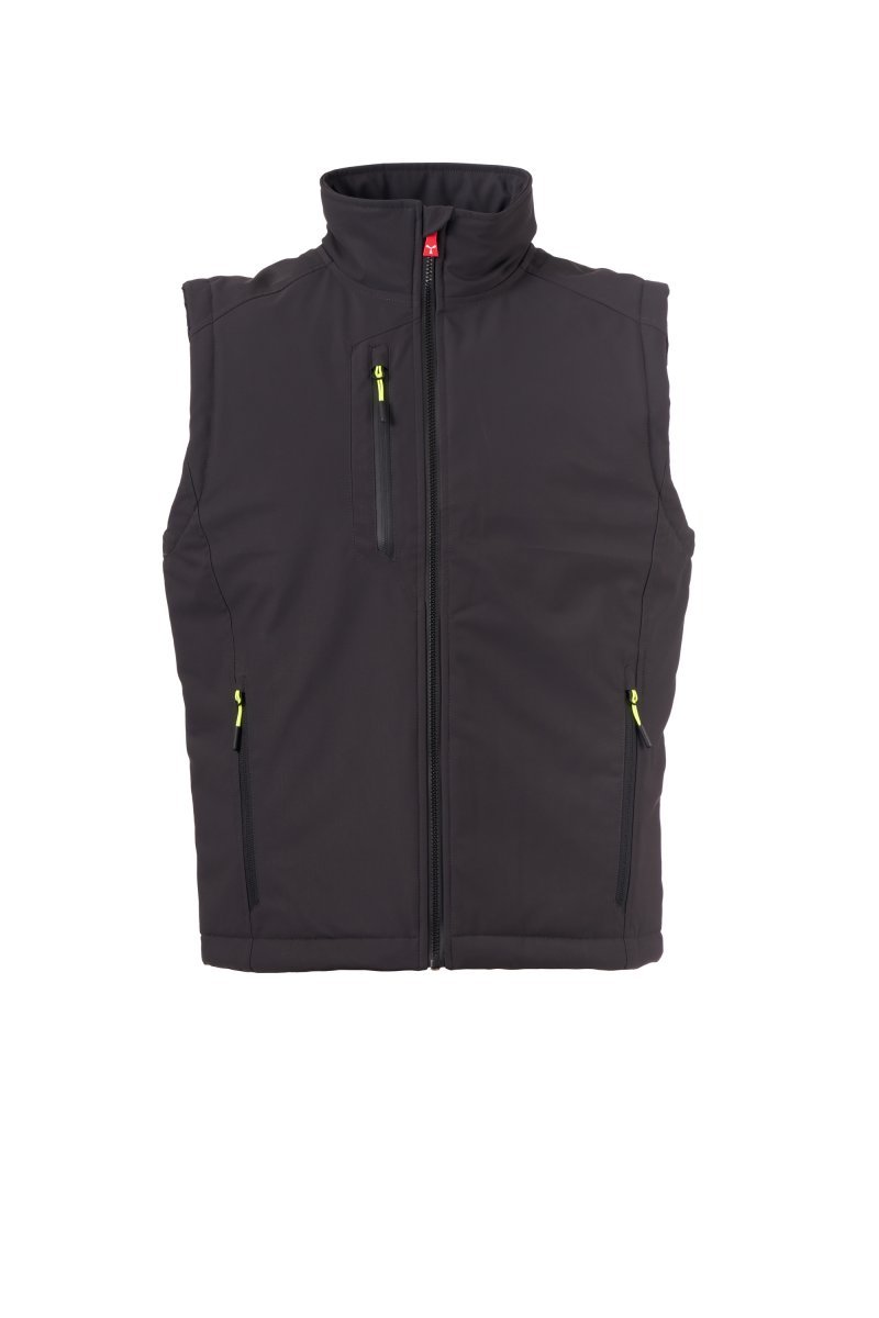 WP 8000 mm H₂O, WVT 5000 g/m² 24 t. Trelags, soft-shell-vest med midels polstring (140g/m²) til herre, SBS-glidelåslukking med «semi-auto lock»-metallglider og tilpasset trekker. Refleksstripe på korsrygg. To sidelommer med glidelås, en brystlomme med belagt glidelås. Fluorescerende trekkere. En innvendig passlomme med borrelåslukking. Justerbar kant med tilpassede stoppere.
