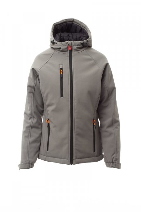 WP 8000 mm H₂O, WVT 5000 g/m² 24 t. Trelags, soft-shell med varm polstring (160g/m²) til dame, glidelåslukking med «semi-auto lock»-metallglider og tilpasset trekker. Fast hette med justerbar snøring. Elastiske mansjetter, justerbare med borrelås. To sidelommer med glidelås og en brystlomme, lukket med en glidelås. Fluorescerende trekkere. To innvendige lommer: én formet glidelåslomme og en nettbrettholderlomme med borrelåslukking. Justerbar kant med tilpassede stoppere.