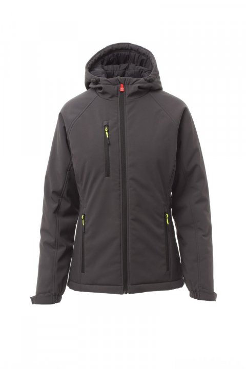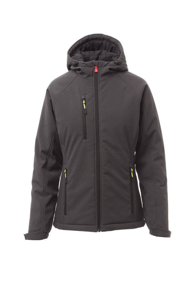 WP 8000 mm H₂O, WVT 5000 g/m² 24 t. Trelags, soft-shell med varm polstring (160g/m²) til dame, glidelåslukking med «semi-auto lock»-metallglider og tilpasset trekker. Fast hette med justerbar snøring. Elastiske mansjetter, justerbare med borrelås. To sidelommer med glidelås og en brystlomme, lukket med en glidelås. Fluorescerende trekkere. To innvendige lommer: én formet glidelåslomme og en nettbrettholderlomme med borrelåslukking. Justerbar kant med tilpassede stoppere.