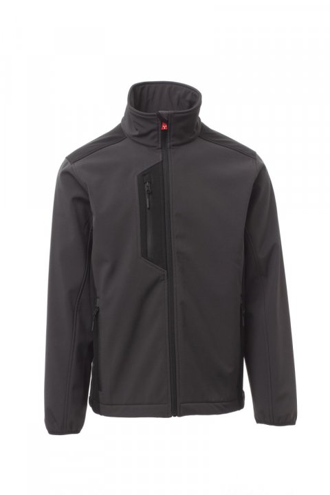 WP 8000 mm H₂O, WVT 5000 g/m² 24 t. Trelags, tofarget soft-shell til herre, glidelåslukking med «semi-auto lock»-metallglider og tilpasset trekker. Elastiske mansjetter med kant. To sidelommer med glidelås, en brystlomme med belagt glidelås. Retrorefleks detalj på bærestykket på ryggen. Justerbar kant med tilpassede stoppere.