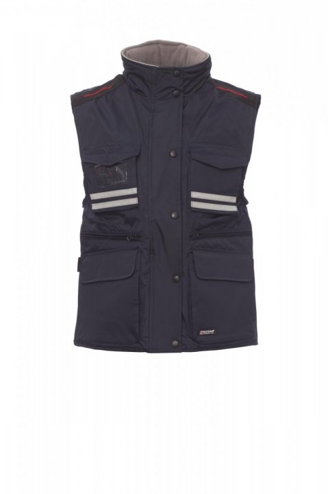 Vest med komfortabel passfor til dame, 8 mm plastglidelås med metalltrekker, med klaff og plastknapper, avtakbar og/eller sammenleggbar hette, grå refleksstriper foran og bak, luftehull i siden med kile og glidelås, ni ytterlommer, to med LOCK SYSTEM, to med glidelås og forsterket innside, en med vendbar merkeholder. Polstret, krage-, rygg- og korsryggvarmer i mikrofleece, innvendig snøring og glidelås for lettere trykk og brodering.