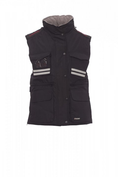 Vest med komfortabel passfor til dame, 8 mm plastglidelås med metalltrekker, med klaff og plastknapper, avtakbar og/eller sammenleggbar hette, grå refleksstriper foran og bak, luftehull i siden med kile og glidelås, ni ytterlommer, to med LOCK SYSTEM, to med glidelås og forsterket innside, en med vendbar merkeholder. Polstret, krage-, rygg- og korsryggvarmer i mikrofleece, innvendig snøring og glidelås for lettere trykk og brodering.