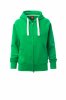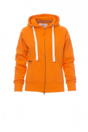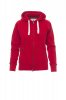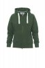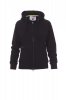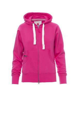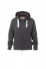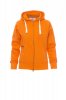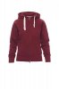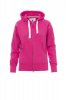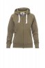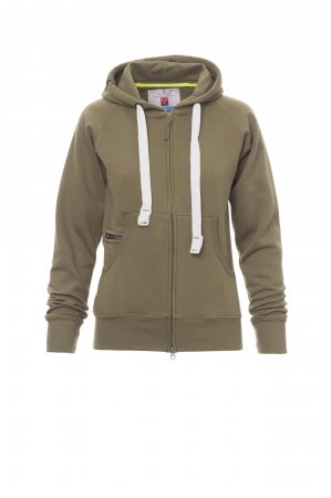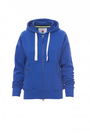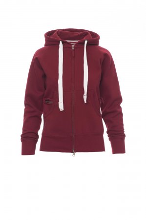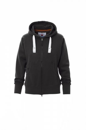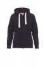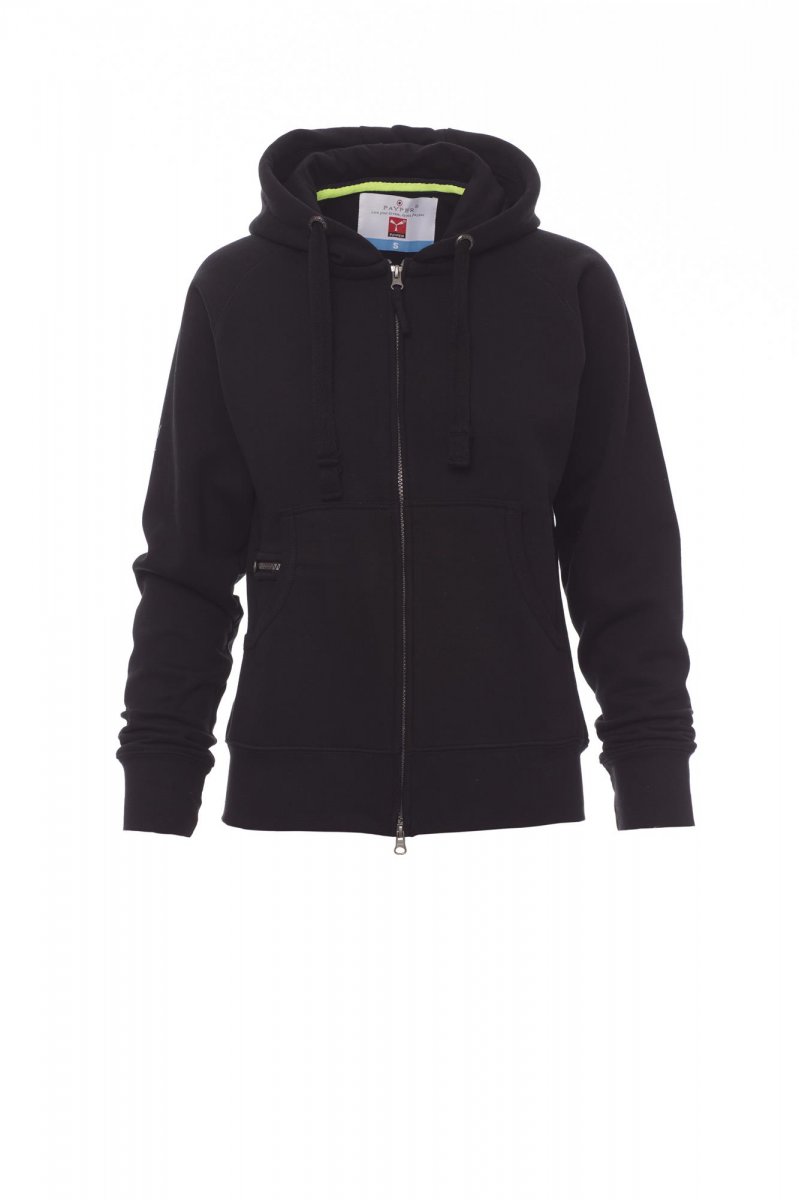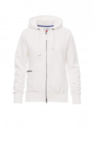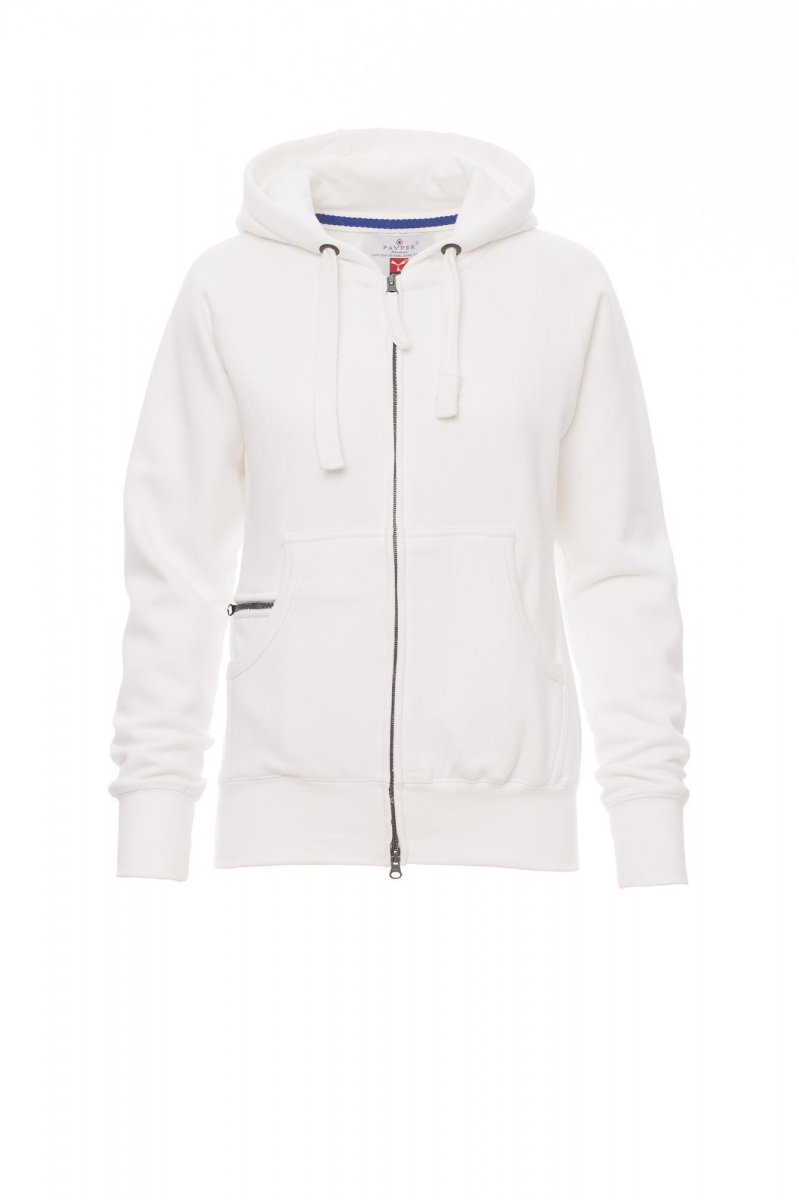 Formsydd hettegenser til dame med hel SBS-glidelås i plast med dobbel metalltrekker, hette med dobbelsydde sømmer og hvit snøring med kontrastsøm og metallringer, raglan-ermer, kengurulommer, liten glidelåslomme, elastiske mansjetter og undekant, forsterkede sømmer.